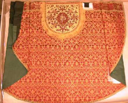 Koorkap van zijden damast: in het rode fond zijn goudgele, symmetrisch geplaatste, gestyleerde bloemen geweven. De damast van het schild heeft een ondergrond van goudgele zijde met het motief in rood. In het midden van het schild bevindt zich een ingeweven ovaal met het monogram I H S. Om de H is een kroon geweven. Het ovaal is omgeven door gestyleerde bloemen en ranken. Langs de omtrek van het schild is een ingeweven rand met bloemtakjes. Het schild is rondom afgezet met gele zijden franje. De aurifrisia (langs de rechte zijde van de koorkap) is gemaakt van zijden damast met geel fond en rode ingeweven, gestyleerde bloemen en ranken. Koorkap, schild en aurifrisia zijn afgebiesd met goudgeel band met bloementakken. De koperen sluiting, met in het midden een rond plaatje met geƫmailleerd bloemetje, is genaaid op twee vierkante, aan weerszijden van het schild uitstekende stukjes zijde. Deze stukjes zijn afgezet met band (identiek aan dat wat langs de koorkap is gezet). Het geheel is gevoerd met groene glanzende keperkatoen en donkergroene satinet.