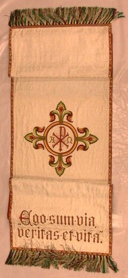 Wit zijden damast lessenaarkleed. In het patroon telkens terugkerend "boom" waarin 2 duiven in een gebogen kader en een levensboom tussen de kaders. In het midden van het kleed is een versierd kruis geborduurd in verschillende tinten geel, bruin, groen en rood. Het kruis bestaat uit gestyleerde bladeren met vruchten. Op het midden van het kruis is een cirkel geborduurd waarin met krullen versierd . Aan een uiteinde is in groen, rose en rood tamboereerwerk de tekst: "Ego.sum.via, veritas.et.vita." aangebracht. De doek is afgezet met goudgeel band waarop wijnranken in rode zijde. Het kleed is gevoerd met rode satinet en rode kunstzijde. Het heeft franje aan de korte einden in de kleuren rood, geel, groen en wit.
