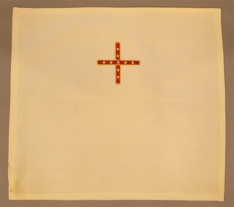 - BeschrijvingVelum van witte ribkunstzijde, gevoerd met okerkleurige zijde. Midden onder op het doek is een kruis genaaid van kunstzijden band in rood met goudgele randen en noppen (was eerst ander kruis opgenaaid?).