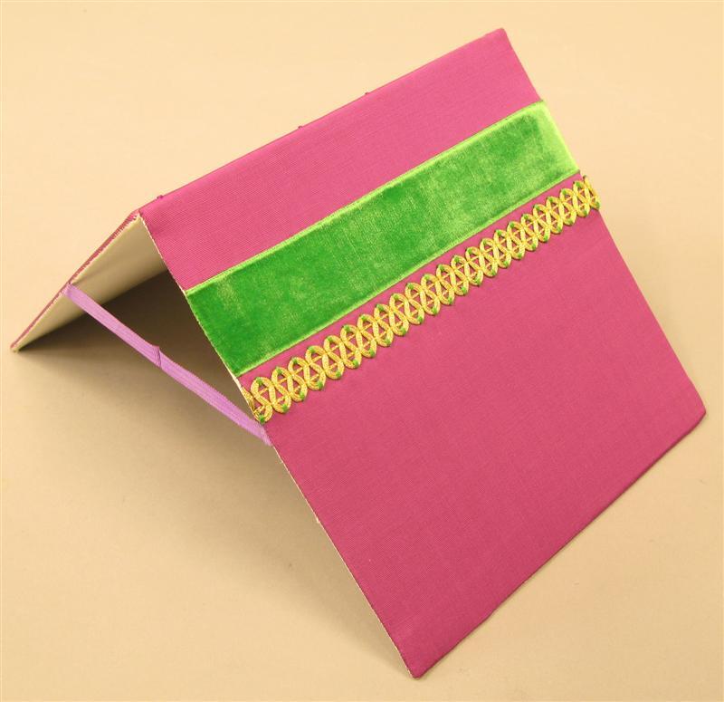 Bursa bovenblad: paarse ribkunstzijde met opgenaaid band. Op 3,5 cm van bovenrand een groen fluwelen bandje van 3,5 cm breed. Daaronder goudgalon met slingerdraad, opgenaaid met groen garen. Gevoerd met wit linnen. Onderblad van paarse synthetische keperstof, gevoerd met wit linnen. Boven- en onderblad zijn aan een zijde met elkaar verbonden door vier paarse trensjes. Aan beide zijkanten is een paars lintje met moiré-effekt genaaid.