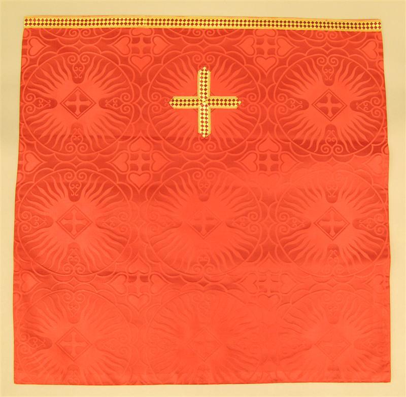 - BeschrijvingKelkvelum van rode zijden damast. Patroon: versierde cirkels, waarin kruisje in ruit, omgeven door stralenkrans. Tussen de cirkels kruisjes, met hartjes aan uiteinden van de balken. Langs de onderkant goudgeel band met rood ruitjesmotief. Midden boven het band een kruisje van hetzelfde band. Gevoerd met rode katoenen satinet.