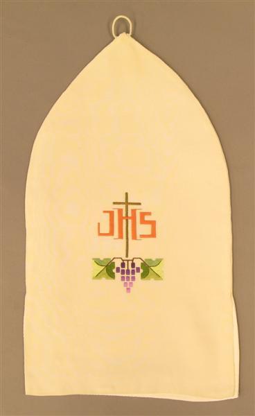 Monstransvelum van witte rib kunstzijde. Op de voorkant borduurwerk in goud, zalmkleur, bruin en verschillende tinten groen en paars. Voorstellend: J H S waaronder een wijnrank met 2 bladeren en een tros druiven. De zijnaden zijn van onderaf over een lengte van 12,5 cm open. Op de punt is een gefestonneerd lusje genaaid. Gevoerd met witte rib kunstzijde.