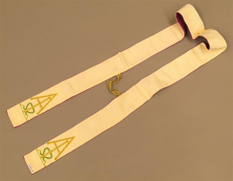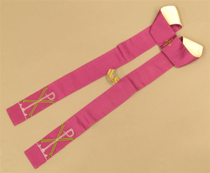 Tweezijdig te gebruiken zakstola van paarse en witte kunstzijden ribstof. Wordt gedragen bij het bedienen van zieken en stervenden. Paars zichtbaar bij de biecht, wit zichtbaar bij de communie. Paarse kant: op beide uiteinden is een monogram geborduurd (X met P). De X in twee kleuren groen, de P en de grondlijn waar de P op staat in 2 kleuren paars. In het midden een kruisje in groen borduurwerk. Witte kant: op beide uiteinden een op grondlijn in 2 kleuren groen. Vanuit de grondlijn rijst een kruis waaromheen de A in twee kleuren geel. In het midden een kruisje in geel borduurwerk. Op 31 cm afstand van de beide onderkanten zijn de slippen met elkaar verbonden door 2 op elkaar genaaide bandjes. Voor en achter hetzelfde band. In het midden goudgele en rode strepen waarlangs goudgele "bladeren".