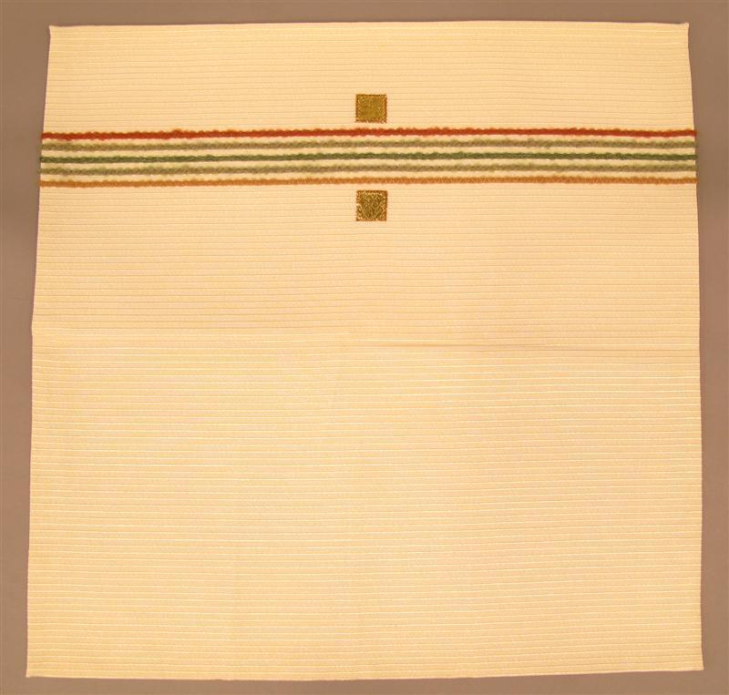 Kelkvelum van witte kunstzijden givrine met fantasierib. Op 9 cm afstand van de onderkant zijn 5 wollen (?) draden in de opeenvolgende kleuren bruin, lichtgroen, groen, lichtgroen en beige, in horizontale strepen genaaid. Midden boven en onder deze versiering is een vierkant stukje goudleer op de ondergrond genaaid. Het velum is gevoerd met cremekleurige kunstzijde. De voering is op twee plaatsen met enkele steekjes aan de ribstof gehecht.