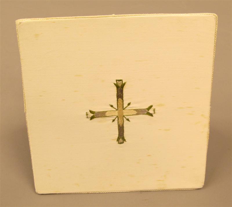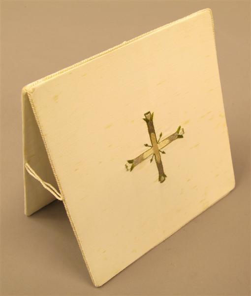 Boven- en onderblad van de bursa zijn bekleed met witte kunstzijden satijn. Op het bovenblad is in het midden met platsteken een kruisje geborduurd in de kleuren: wit, grijs en groen. Om het bovenblad is een wit kunstzijden koordje bevestigd, dat aan beide zijden van de bursa, het bovenblad met het onderblad met een lus verbindt. De bursa is gevoerd met wit linnen.