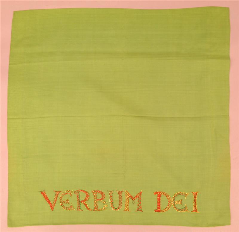- BeschrijvingGroen lessenaarkleedje van kunstzijden ribstof. Langs de onderkant is de tekst " VERBUM DEI " geborduurd. Borduurwerk in allerlei fantasiesteken in de kleuren bruin, geel, groen (licht en donker) en goud. Het kleedje is gevoerd met groen katoenen satinet.