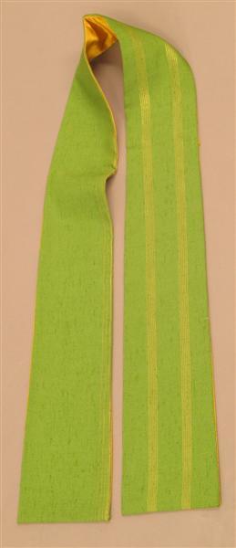 - BeschrijvingManipel van groen rayon "linnen" met effektstrepen van gouddraad. Op 41 cm van de onderkant van beide slippen waren deze d.m.v. gele trensjes met elkaar verbonden (nog restjes garen aanwezig). Gevoerd met gele kunstzijden keperstof.