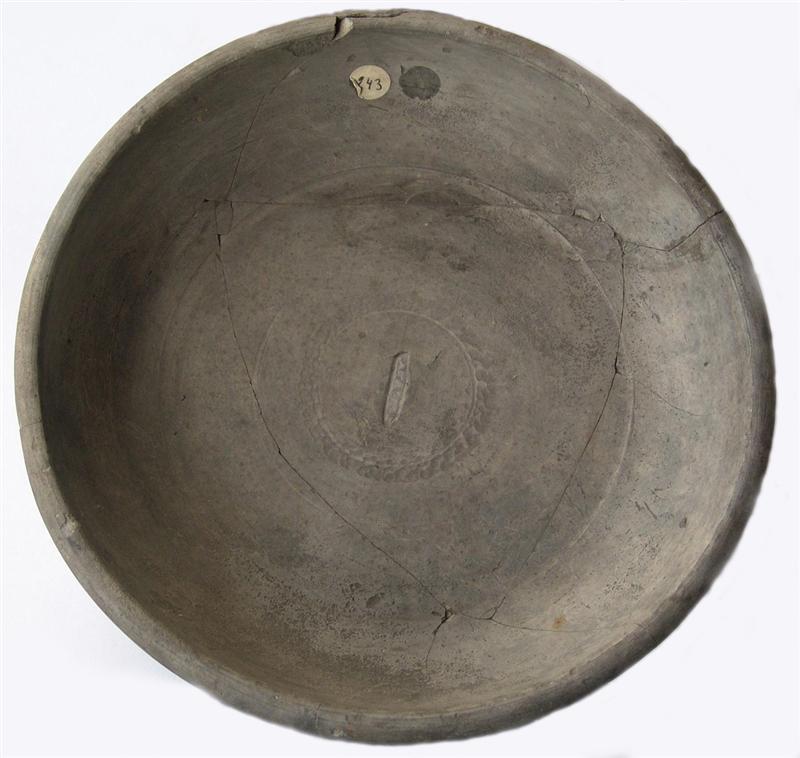 - BeschrijvingDe voet gaat bijna onmerkbaar over in de wand, die enigszins naar binnen gebogen is. De zwarte laag is bijna helemaal verdwenen. Van Hoek spreekt van 'Belgisch' aardewerk. Een onleesbaar stempel met er omheen een touwbandversiering