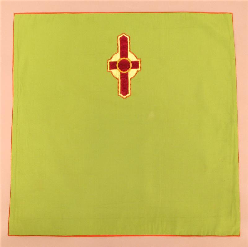- BeschrijvingKelkvelum van groene zijden ribstof. Middenonder versierd met opgenaaid kruisje: rood kruis in chenillegaren, op het midden groene ring. Achtergrond goudkleurig. Langs rand met groen en bruin garen op ondergrond gehecht. Voering: Rode katoenen satijn.