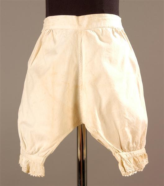 - BeschrijvingWit linnen onderbroekje met splitjes aan de zijkanten. Aan weerszijden van de tailleband (voor en achter) witte keperbandjes om splitjes te sluiten. Langs zoom van de pijpjes witte kantjes met wit open borduurwerk.
