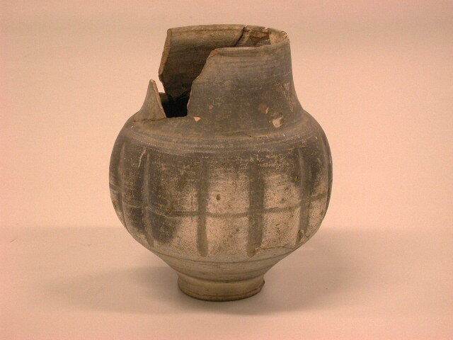 - BeschrijvingTerra nigra beker met bolle buik, talrijke malen verticaal gedeukt en met arcering, hoge hals. De wand heeft 13 lichte deukjes, waaromheen 3 banen raadjesversiering. De beker is vervaardigd van lichtgrijze klei en van binnen geheel en van buiten deels met een blauw-zwarte laag overdekt.