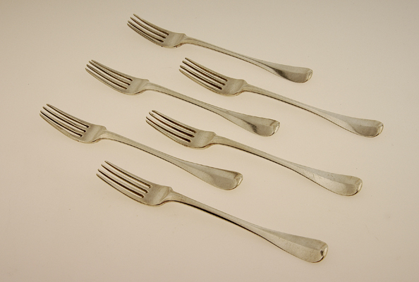 6 "kleine" vorken 4 tanden. Trembleersteek op achterzijde steel.