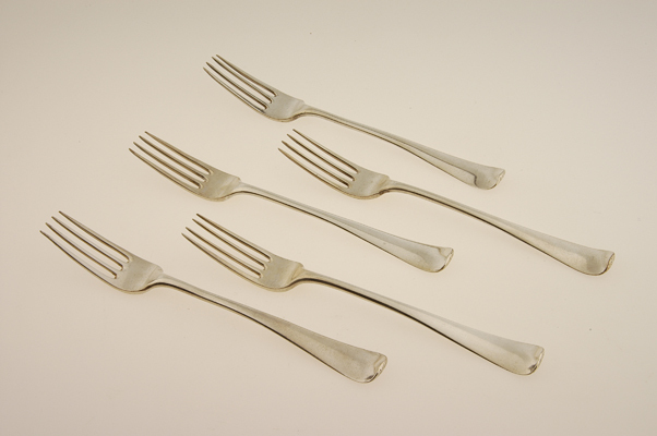 - BeschrijvingVijf grote vorken steeluiteinde sterk omhoog gebogen. Op opstaande stukje gegraveerde inscriptie: V.R. 4 tanden. Trembleersteek op achterzijde steel. V.R. zijn de initialen van Victor van Rijckevorsel.
