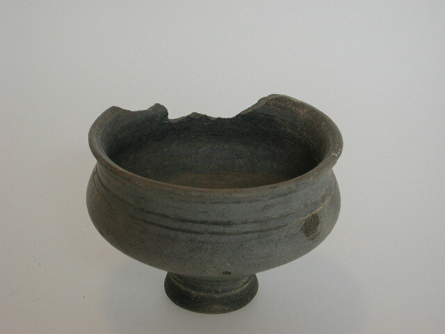 Kommetje van grof aardewerk op een vrij hoog voetje, dat enigszins geprofileerd is. Het voetje gaat in een rechte lijn over in de wand, die ver boven het midden naar binnen buigt en dan weer verwijdt tot de rand. Op de insnoering zijn vier groeven getrokken. De kom is vervaardigd van grijze klei met een donkergrijze laag. Van Hoek spreekt van 'Belgisch' aardewerk. Kommen van dit type komen in nagenoeg ongewijzigde vorm voor gedurende de gehele Romeinse periode.
