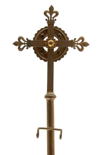 Draagbandelier van zwart gelakt leer. Met koker van leer en koperen gesp.