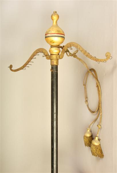Zwarte houten stok, onderaan iets spits toelopend. Op 45 en 64.5 en van onder is een gat geboord. Op 169.5 cm van onder een schroef aan de achterkant. Onder de bekroning een metalen haak. Bekroning van verguld, gedraaid hout op een ring een grote bol, naar boven uitlopend in een kleine. In grote bol horizontale ribbels, rood, wit en blauw geschilderd. Onder houten bekroning een metalen huls (4.7 cm hoog), waaraan links en rechts uitstekend een accoladevormige metalen band bevestigd is. Links en rechts in band 15 gaatjes, waardoor aan rechterzijde 13 en aan linkerzijde 14 metalen haken. Om houten bekroning is een koord van gouddraad geknoopt. Aan ieder uiteinde van dit koord een kwast van verguld hout en gouddraad. Koord ca. 325 cm lang.