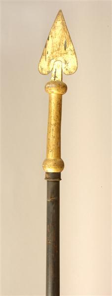 - BeschrijvingZwarte houten stok met vergulde punt: metalen vergulde huls met twee houten ringen op huls metalen punt. In stok 17 spijkertjes met restjes oranje wol.