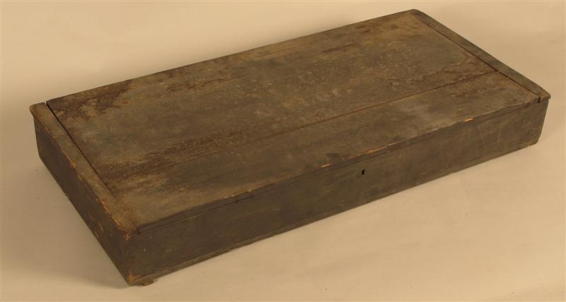 - BeschrijvingVan het smidsgilde "St. Eloy". Zwarte houten kist met plat deksel. Aan achterkant kist twee scharnieren, aan voorkant slot zonder sleutel. Op deksel in wit de tekst: "VAAN/ST ELOI./1851.". Op binnenkant deksel in wit de tekst: "de derectie/F. Bouvee. Presedent./A.van Dijk. Secretaris./Jan Scheffers. Commissaris./ (.....)" Op onderzijde kist twee latjes.