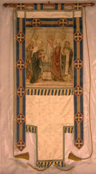 Met voorstelling van Jezus in de tempel. Ondergrond: witte zijden damast met een motief van kruisjes in cirkels. Op de bovenste helft van het vaandel een op fluweel geschilderde afbeelding van de voorstelling van Jezus in de tempel. In de tempel voor een altaar met blauw kleed staan van links naar rechts Simeon, Maria, Jozef met Kind Jezus en Anna. Simeon met bruin kleed en grijze mantel, houdt stok in rechter hand. Maria met rood kleed, blauwe mantel en witte hoofddoek. In haar hand een schaaltje met twee duiven. Jozef met groen kleed en bruine mantel, draagt op een witte doek het kind Jezus met rod kleedje. Anna, met geel kleed, blauwe mantel en gestreepte hoofddoek, draagt een banderol waarop de tekst: "+ et.erat.anna.prophetis.filia phanuel.de.trib.asc". Aan het plafond hangen twee brandende olielampen. Langs de bovenkant van fluweel en langs de zijkanten van het vaandel is 8.2 cm breed band gestikt. Band: rayon in blauw, rood en geel. Motief: kruisjes in op de punt staande ruiten, verbonden door smalle banen met vlechtpatroon. Het band eindigt links- en rechtsonder in een afgepunte slip. De witte damast loopt onderaan uit in de middelste slip. Overige randen afgezet met smal blauw/geel band met vlechtpatroon. Onder aan fluweel en aan witte zijde franje in blauw en geel. Aan bovenkant 4 lussen van het bovenbeschreven brede band. Daardoor een gelakte houten stok, aan beide uiteinden afgepunt en voorzien van houten ringen, elk met 2 rode randjes. In het midden van de stok een metalen schroefoog. Om de stok is een geel koord, met aan beide uiteinden een gele kwast, geknoopt. Voering van gele katoenen satijn. Aan onderste slip twee gele bandjes op voering genaaid. Vaandel ook omschreven als: sacramentsvaandel met een van de vijf blijde geheimen.