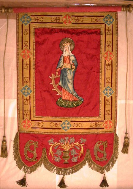 Met voorstelling van de H.Catharina. Vaandel van rode zijden damast met een motief van wijnranken, bloemen en korenaren. Midden op het vaandel de H. Catharina met bij de rechterhand een gebroken rad en in de linkerhand een zwaard. Catharina is uitgevoerd in zijden applicaties en borduurwerk. Ze draagt zwarte, met goud geborduurde schoenen, een rood kleed, blauwe mantel met cremekleurige voering, witte hoofddoek en gouden kroon. Hoofd, hoofddoek en kroon zijn geheel geschilderd. Kleding is bijgeschilderd. Rad is getamboereerd in beige tinten. Zwaard van zilver en gouddraad met groen glazen "steentje" in goudkleurig metaal gevat. Achter hoofd een nimbus van goudbrokaat met borduurwerk in goud en goudkleurige pailletten. Catharina staat op een grasveldje van beschilderde stof met geborduurd gras en bloemen. Om deze voorstelling een rechthoekige lijst van goudbrokaat met versieringen van rood fluwelen band, getamboereerd krulwerk in rood, goudomrande rode en blauwe fantasieruiten. In de blauwe ruiten goudkleurige leliekruisjes en in de rode goudkleurige franse lelies. Goudbrokaat aan twee zijden afgezet met goudband met visgraatmotief. Onder aan het vaandel slippen, de buitenste puntig, de middelste rond. Op buitenste slippen in goudbrokaat met rood en gouddraad omrand het monogram "AS". Op middelste slip een vaas met bloemen in goud en zilverbrokaat en borduurwerk in rood, geel en goud. Langs de slippen goudfranje. Onder aan iedere slip een goudkleurige kwast. Broek en voering van rose rayon satijn met ingeperst damastmotief. Op voering van middelste slip rose satijnen lintje. Door broek houten stok met in het midden een metalen schroefoog en aan beide uiteinden vergulde houten knoppen. Aan iedere knop een goudkleurig koord waaraan een goudkleurige kwast. Ook wel sacramentsvaandel genoemd.
