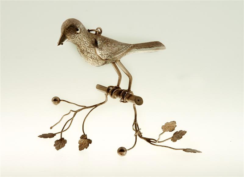 Zilveren vogel op tak, waaraan takjes met bladeren en vruchten (bolletjes). Beide zijden van de vogel identiek.