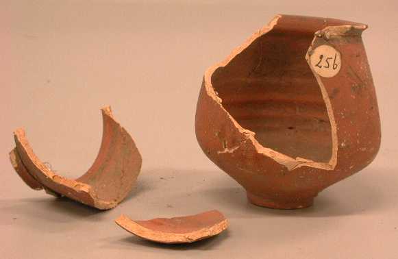 - BeschrijvingCylindervormig bekertje op smalle voet met kleine rand (karniesrand) en strakke wand. Gevernist en uit de hand beschilderd. Witte aarde met roodachtig of geelbruin vernis met zandbestrooiing