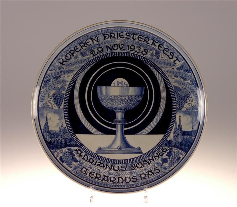 - BeschrijvingAardewerk wandbord t.g.v. het koperen priesterfeest van Adrianus Joannes Gerardus Ras, pastoor van de Leonarduskerk te 's-Hertogenbosch, 20 november 1938. Zgn. delftsblauw aardewerk met de produktie hiervan begon de genoemde Goudse fabriek in 1920. De schilder Arend Stolk was meer dan 40 jaar in dienst bij Zenith.