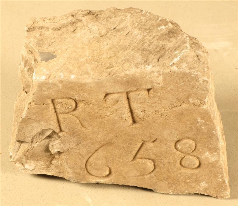 Met jaartal. Opschrift "RT/1658" Afkomstig uit de westelijke muur van het binnenplein achter het stadhuis.