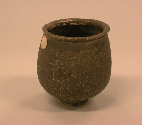 - BeschrijvingCylindervormig bekertje op smalle voet met kleine rand (karniesrand) en strakke wand. Witte aarde met bruin tot zwart vernis. Uit de hand beschilderd. Met zandbestrooiing