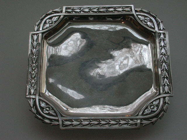 - BeschrijvingVierkant blaadje, ook cabaret genoemd, voorzien van een gedreven rand van aaneengeschakelde bloemkelken (culots), met in de hoeken een bloemrozet. De vier pootjes hebben de vorm van een gekruld blad. De decoratie heeft een Zuidnederlands karakter.