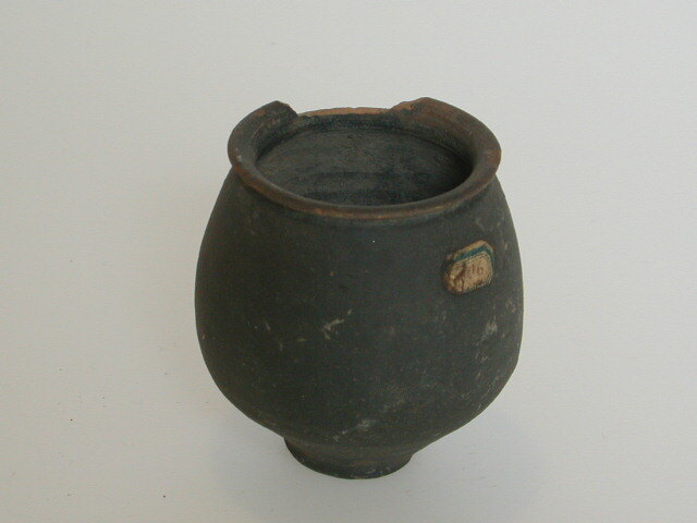 - BeschrijvingCylindervormig bekertje op smalle voet met kleine rand (karniesrand) en strakke wand. Roodachtige aarde met bruin vernis (bijna zwart). Glad.
