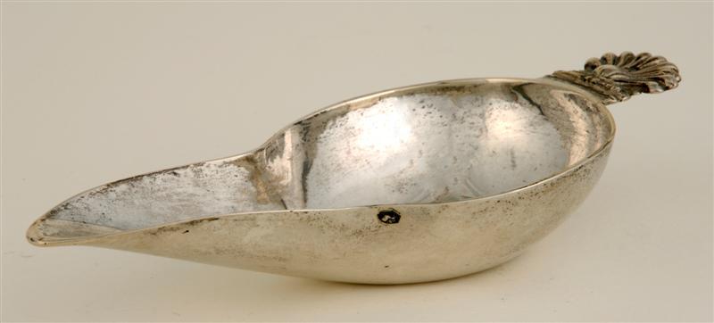 - BeschrijvingZilveren schuitje met palmetvormig handgreepje.