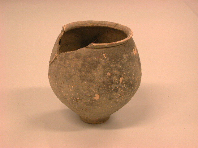 - BeschrijvingCylindervormig bekertje op smalle voet met kleine rand (karniesrand) en strakke wand. Witte aarde met bruin tot zwart vernis. Uit de hand beschilderd, met zandbestrooiing