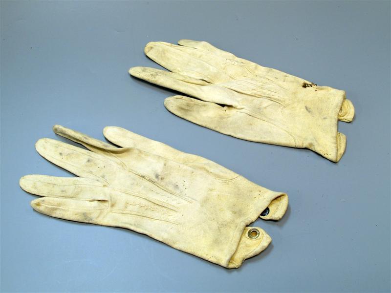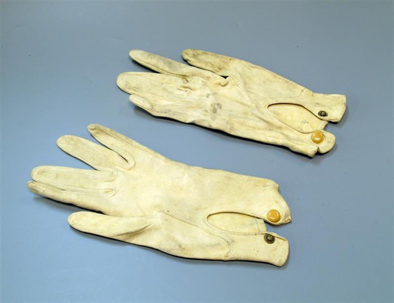 - BeschrijvingWitte zeemleren handschoenen. Op de hand 3 koppeltjes waartussen 2 met wit garen geborduurde takjes. Sluiting met metalen drukker, aan de buitenzijde voorzien van een beige knoop. Vergelijk met inv.nr. 11747.080 en 081.