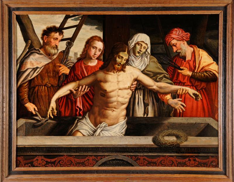 Josef van Arimatea had van Pilatus toestemming gekregen Jezus' lichaam van het kruis te nemen. Afgebeeld is het moment dat hij, geholpen door Maria Magdalena, zijn vrouw Maria en Nikodemus, die de balsem had meegebracht, het lijk van Christus in het graf dat hij voor zich zelf had laten aanleggen, laat zakken. In de afbeelding zijn elementen te vinden uit de vier verschillende evangeliƫn.