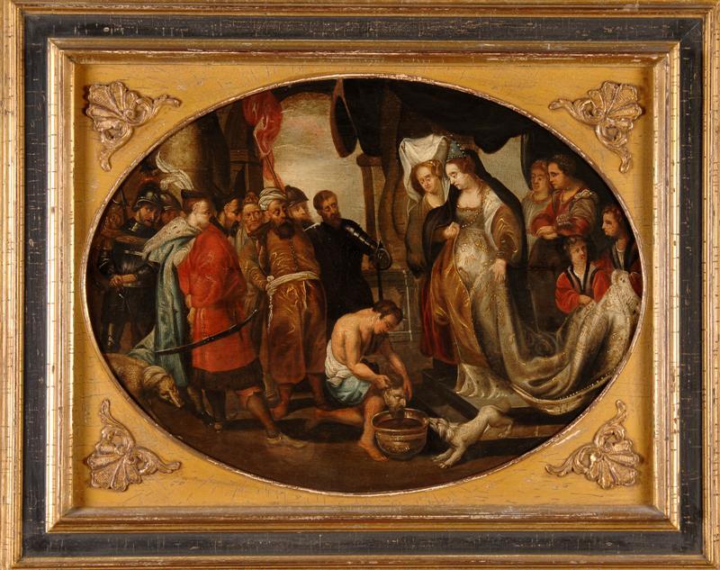 Herodotus verhaalt in zijn Historiƫn (201-216) over koningin Thomyrus die regeerde over de Massageten. Cyrus dong naar haar hand. Thomyrus weigerde omdat zij wist dat het hem te doen was om haar land. In de oorlog die toen uitbrak werd haar zoon gevangen genomen en pleegde vanwege de schade zelfmoord. Thomyrus weet Cyrus uiteindelijk te doden en wraakte haar zoon door het afgehouwen hoofd van Cyrus in mensenbloed onder te dompelen, omdat hij bij zijn leven met bloed niet te verzadigen zou zijn geweest. Dit laatste moment is op het schilderij afgebeeld. Het origineel is niet ovaal maar rechthoekig. Het wijkt in kleding en omvang van de mensen ook af van dit schilderij. De omgeving waarin de personen zich ophouden is volledig anders. De hond bij de pot zien we niet terug op het origineel. Achter Thomyrus staat op het schilderij van Rubens een persoon meer.