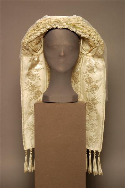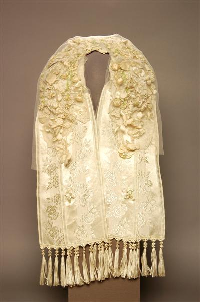 Romp en vleugels samengesteld uit katoen, gaas en papier. Romp verstevigd met dik laiton. Onder de romp is een elastiekje genaaid. Voor- en achterstrook van in platte plooitjes gelegde kant. Onder achterstrook een lusje van neteldoek. Ecru kunstzijden strikken, aan de bovenzijde verlengd met neteldoek. Strikken met slingerend bloemmotief op ingeweven middenband in ribbinding. Open randjes aan de zijden van het lint. Ecru flossen. Over de strikken 'zig-zag' gelegde kant. Op de romp ecru bloemen en blaadjes, afgewisseld met groene takjes en groene en rose bloemen en meeldraden. Over het geheel witte tule.