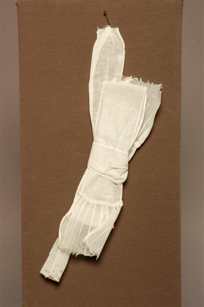 - BeschrijvingVan witte katoen, voor Oirschotse cornetmuts. 2 strikken met onderaan een geplooid strookje neteldoek 1 strik met oogje.