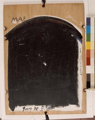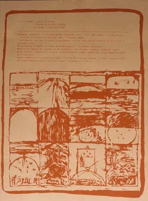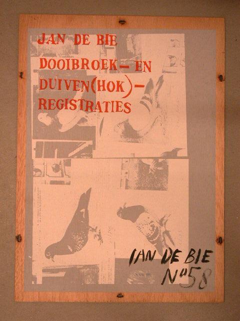- BeschrijvingMap met zes bladen zeefdrukken in een omslag, nr. 58. Map: houten voor- en achterkant, met linten bijeen gebonden. De buitenkant beschilderd en bedrukt, o.a. met: 'JAN DE BIE/DOOIBROEK-EN DUIVEN(HOK) REGISTRATIES'. Omslag: bedrukt met voorstellingen en tekst betreffende het werkproces aan 'dooibroek'. Bladen grafiek: in tweeën gevouwen, de binnenzijde bedrukt, de buitenzijde beschilderd.