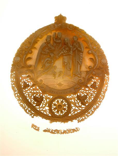 - BeschrijvingParelmoerreliƫf. In parelmoer gesneden voorstelling van de Aanbidding der wijzen, hier afgebeeld als koningen voor het Christuskind, Maria en Jozef. Rondom versiering in de vorm van bladeren, ranken en bloemen, in de onderste helft in ajour. Op een banderol onder de voorstelling "Bethlehem". De vorm van de schelp is bewaard.