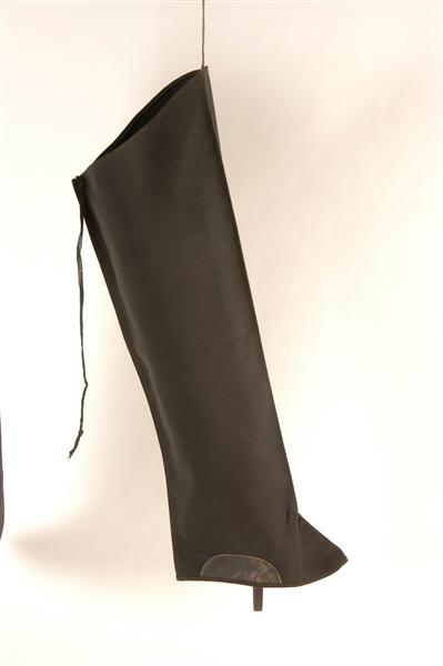 "Slobkousen" reikend tot aan de lies van zware zwarte keperkatoen. Aan de bovenzijde van elke kous is een zwart leren riempje met gaatjes bevestigd, waaraan een bijbehorend riempje met metalen gesp. Aan de onderzijden van de kousen zijn klepjes voor de voeten genaaid. Onder de voeten zwarte leren bandjes bevestigd met metalen .. De aanhechtingsplaatsen zijn verstevigd met opgenaaide stukken zwart leer. Aan de binnenkant langs de onderrand aan de hielzijde verstevigingen van zwart gelakte katoen. Aan de bovenrand, vlak bij de naad een restje garen, waarmee mogelijk bandjes vastgenaaid zijn geweest. Aan de linkerkous is met een sluitspeld een recht zwart katoenen bandje bevestigd (origineel?)