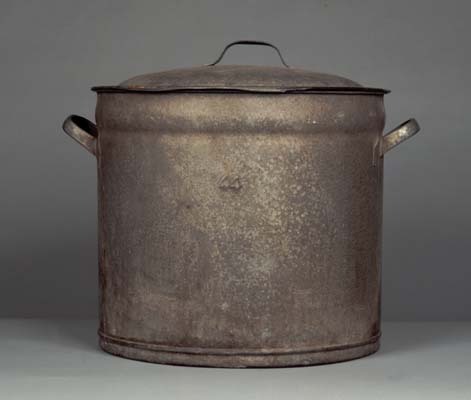 Ronde zinken ketel met 2 handgrepen. Bol deksel met een handgreep.