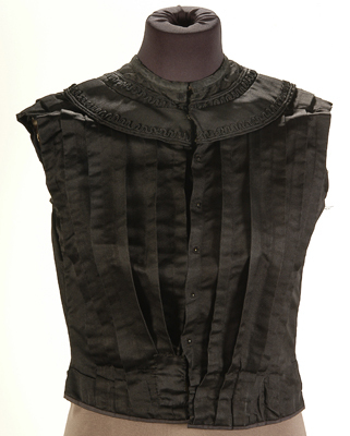 Zwart zijden jak met kort, aangeknipt schootje. Het voorpand is versierd met plooien. Tussen de middelste plooien 4 groene fluwelen knopen. Bovenaan een vierkant opgenaaid stukje waarlangs een smalle kraag. Langs de hals een op de voering genaaid inzetje van zwarte katoenen kant op een zwarte ondergrond. De rugpanden zijn versierd met plooien en worden in het midden gesloten met drukkers en haken en ogen. Bovenstukje van voorpand en kraag versierd met soutacheband. Voering van écrukleurige katoen, bedrukt met blauwe en grijze strepen. Op 2 coupe-naden en op de middennaad van de voering van het voorpand zijn bruine bandjes genaaid, waarachter (hoornen?) baleintjes geschoven zijn. Het jak heeft geen mouwen, mogelijk waren ze oorspronkelijk wel aanwezig.