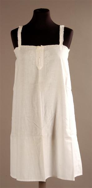 Hemd van witte katoen. Aan de bovenkant recht afgesneden, met splitje middenvoor en rechte schouderbanden. Panden gerend gesneden, niet getailleerd. Splitjes aan de onderkant in de zijnaden. Langs de banden de bovenkant en het split een open randje en een smal machinaal kantje. Split gesloten door een aan de achterkant opgenaaid stukje katoen. Aan weerszijden van het split een open randje en een machinaal geborduurde bloem. Bandjes verstevigd met een strookje katoen op de achterkant. Versteviging split en bandjes waarschijnlijk later aangebracht.