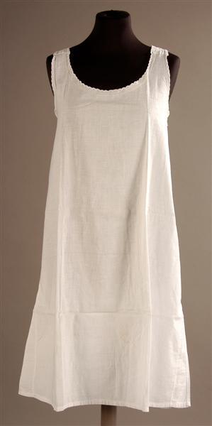 - BeschrijvingHemd van witte katoen. Ronde hals en ronde armsgaten, afgewerkt met een geschulpte gefestonneerde rand en een open randje. Rechte, gerende geknipte zijnaden met onderaan ingezette spietjes. Sluiting op de schoudernaden met knoop van wit glas en knoopsgat. Sluiting op rechterschouder dichtgenaaid en knoopje verwijderd. Langs de hals een (later) ingenaaid plooitje.