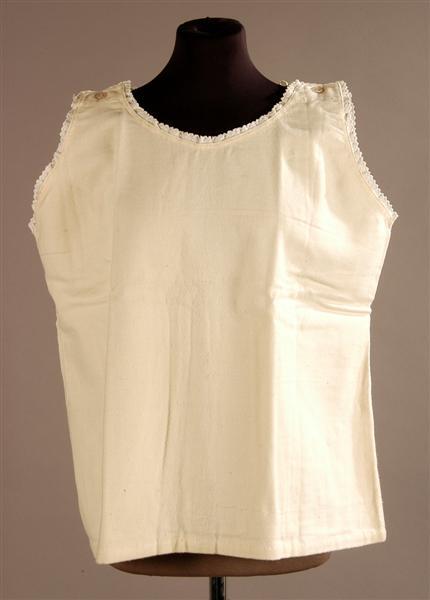 - BeschrijvingHemd van naturelkleurige katoenen flanel. Ronde hals en armsgaten, afgezet met een katoenen galonnetje. Rechte, gerend geknipte zijnaden. De schouders worden gesloten met een parelmoeren knoopje en een knoopsgat en zijn gevoerd met een ecru wollen lapje. Een van de lapjes heeft een rode zelfkant waarlangs een smal donkerblauw streepje.