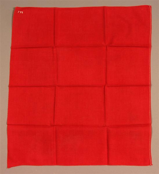 Effen rode katoenen zakdoek. Casimirkeper. Een zelfkant niet gezoomd, een lengtezoom met wit garen gestikt, de 2 andere zomen met rood garen.
