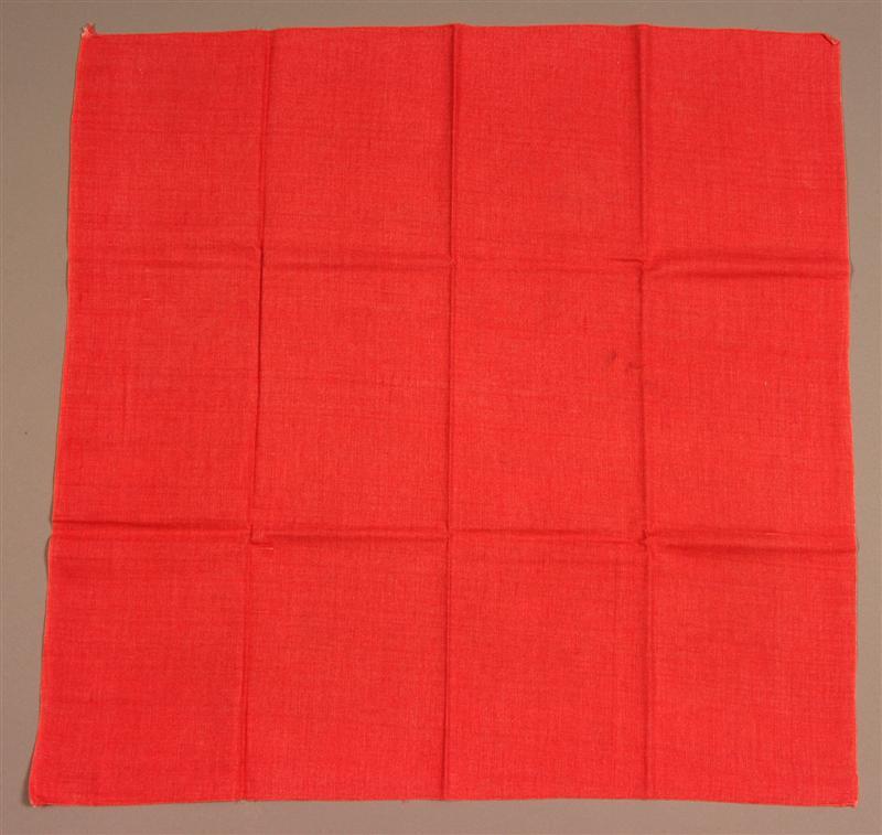 Effen rode katoenen zakdoek. Casimirkeper. Beide zelfkanten niet gezoomd andere zoompjes met rood garen gestikt.