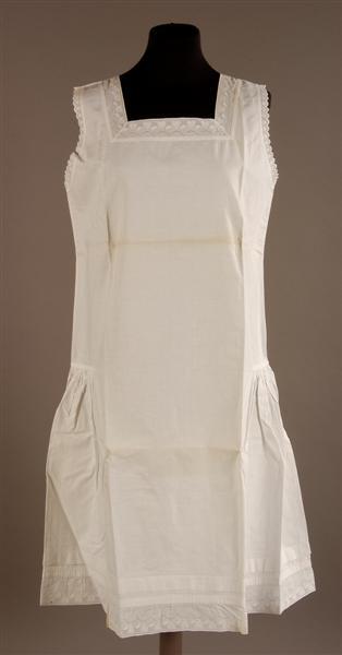 Witte katoenen onderjurk. Vierkante hals, afgezet met brede broderie-anglaise kant. Armsgaten afgezet met smalle broderie-anglaise kantjes. Zijnaden gerend geknipt vanaf armsgaten tot op heuphoogte. Aan beide zijden, op heuphoogte, een horizontaal naadje waaraan een gerimpeld rokdeel. De onderjurk heeft boven de zoom een opnaad. De zoom is afgewerkt met een licht aangerimpelde strook broderie-anglaise kant.