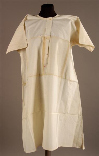 Wit katoenen hemd. Ronde hals met split middenvoor. Split afgewerkt met een beleg en te sluiten met 2 katoenen knoopjes en 2 knoopsgaten. Recht ingezette mouwtjes met onder de oksels ingezette stukjes. Rechterzijde: zijnaad gerend gesneden en doorlopend tot op de schouder. Linkerzijde: onder het oksel een ingezet gerend zijstuk, de naad tussen zijstuk en voor- resp. achterpand loopt verticaal door tot op de schouder. Werd onder het korset gedragen.